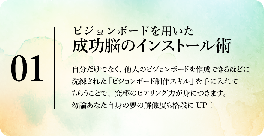 ビジョンボードというアイテムを主軸に成功するノウハウ・ツール・経験、全てをあなたにインストールすることのできる新時代的なスクールです。